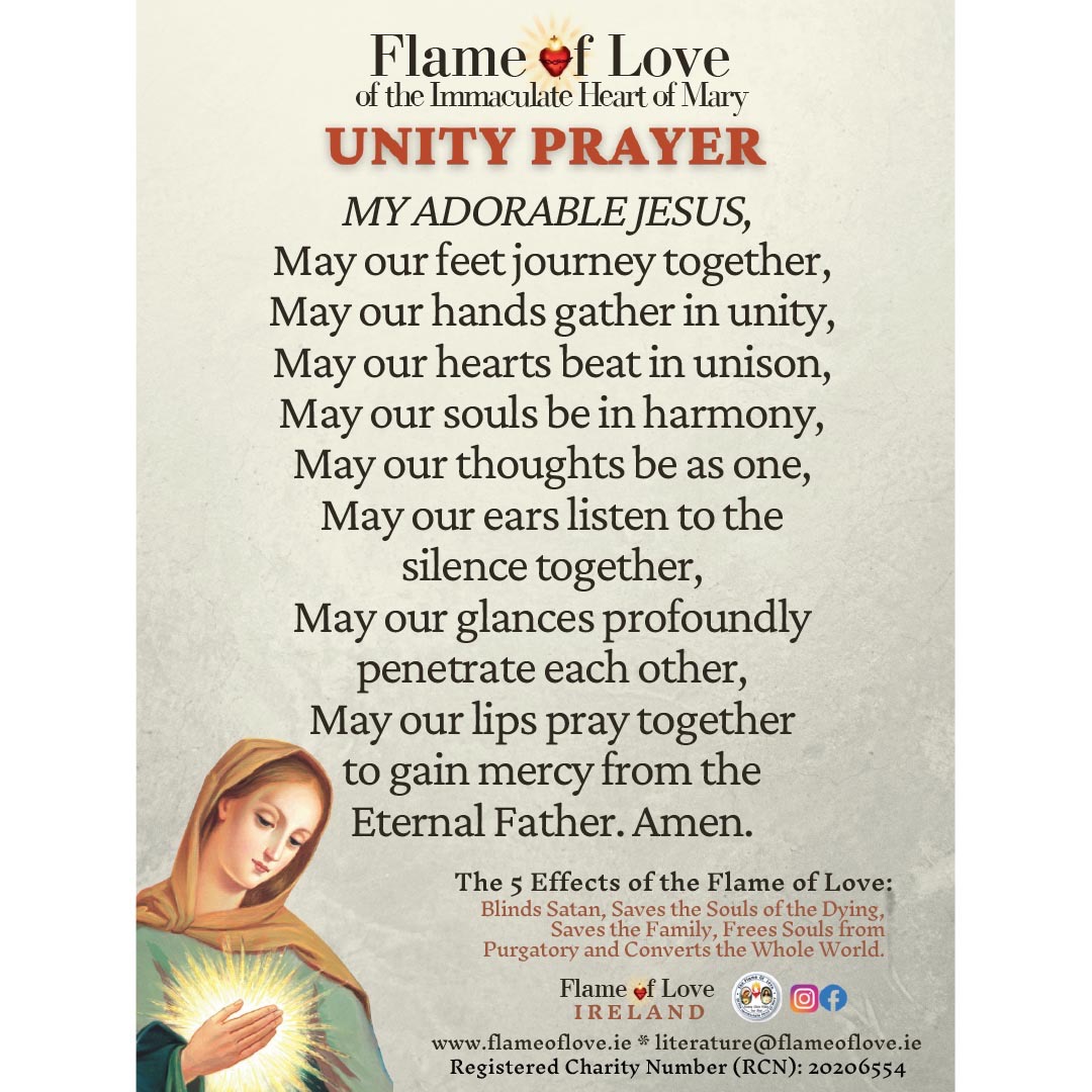 With a filial confidence, we pray to you, Virgin Mary, that with the Flame of Love of Your Immaculate Heart, kindled by the Holy Spirit, you ignite in our languid hearts the fire of a perfect love for God and all of humanity, so that together with You, with one heart, we love God and our neighbour.